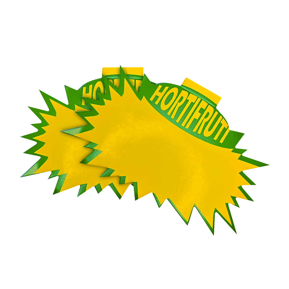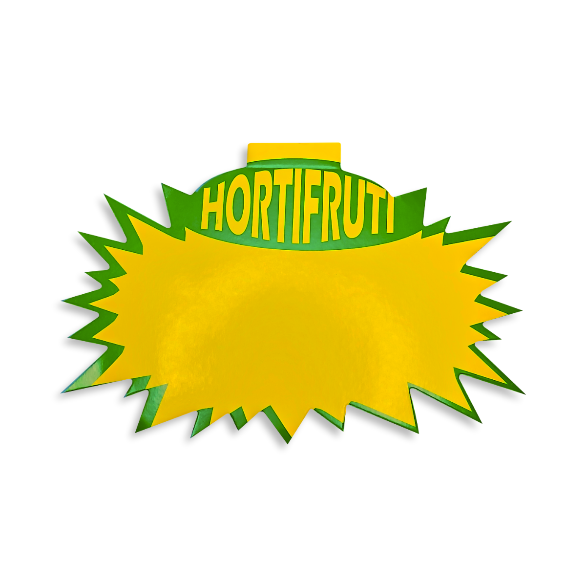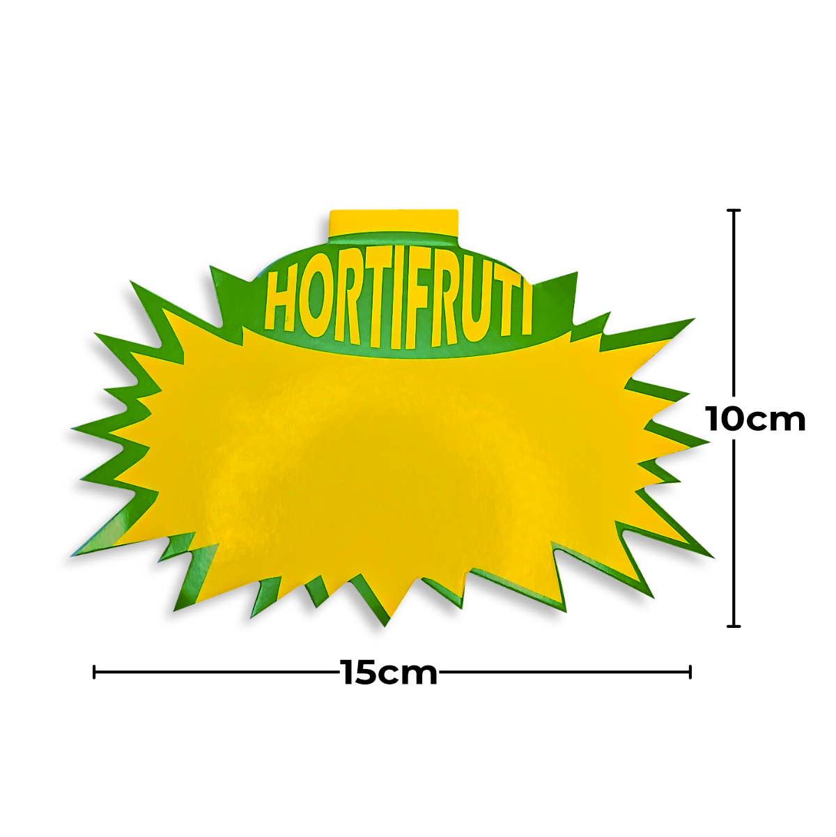 Cartazes splash para hortifruti práticos e chamativos, ideais para destacar preços e promoções de frutas e verduras, em pacote com 100 unidades.