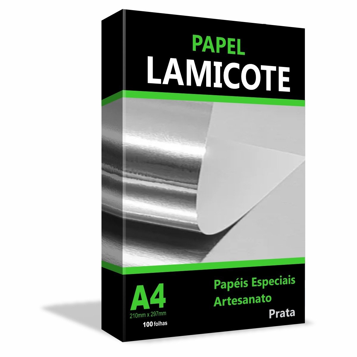 Papel laminado A4 250g prata cromo com 100 folhas, ideal para projetos gráficos, embalagens e trabalhos com acabamento profissional.